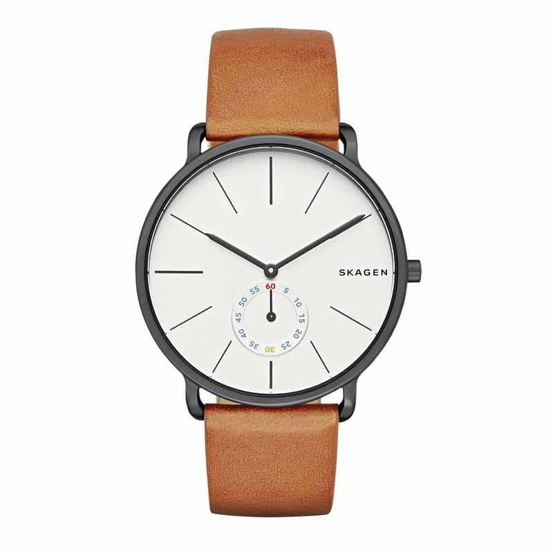 Introducing the sophisticated Hagen watch, featuring a supple leather strap and sleek stainless steel case. The minimalist dial includes a sub-second timer for precise timekeeping. Inspired by the serene horizon of Skagen, the watch boasts smooth, elegant lines for a timeless look. Elevate your style with this modern timepiece,