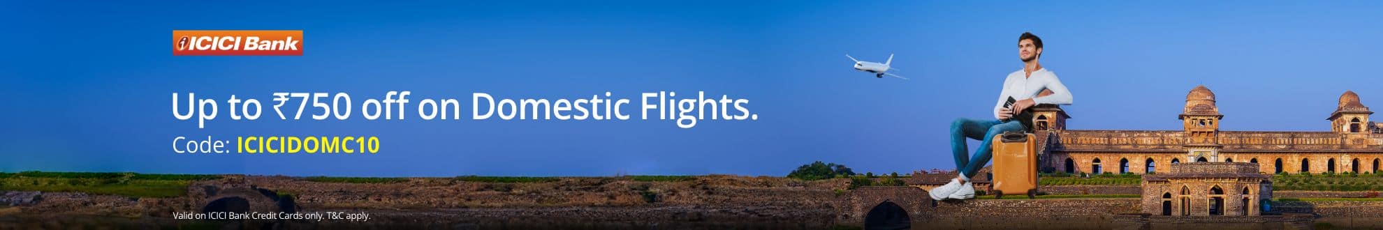 The customer will receive instant discount on domestic flight bookings as per the offer for the amount paid through ICICI Bank Credit Cards only (excluding ancillaries, insurance, and convenience fees).