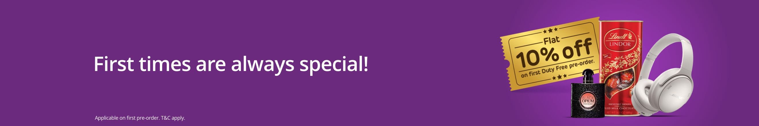 The user making first-time online duty-free purchase gets a 10% additional discount on order pre-booked for arrival/departure pickup. (Offer)